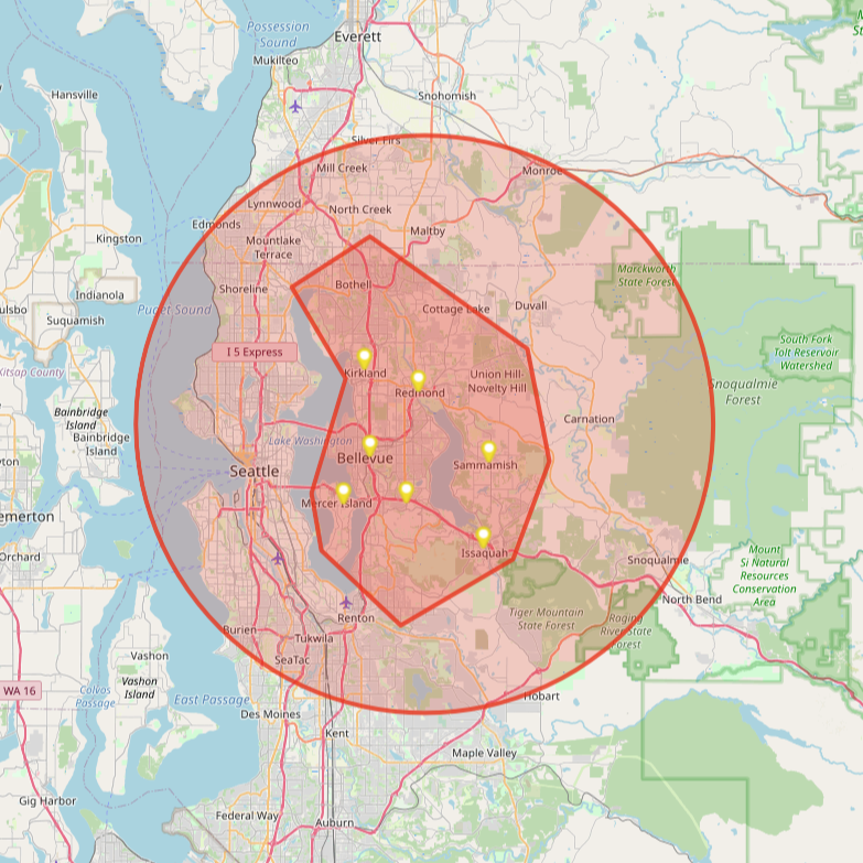 Bellevue, Redmond, Kirkland, Bothell, Mercer Island, Newcastle, Sammamish, and Issaquah.